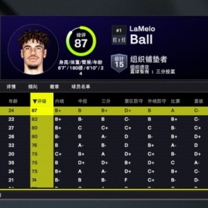 8月30日最新消息 NBA 2K26球员能力值正式揭晓,黄蜂队评分详情如下:拉梅洛·鲍尔以87分领跑全队,布兰登·米勒8...