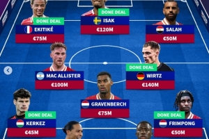 体育资讯9月2日讯 利物浦压哨签下伊萨克为今夏疯狂引援画上句号,《转会市场》也预测了红军新赛季主力阵容。