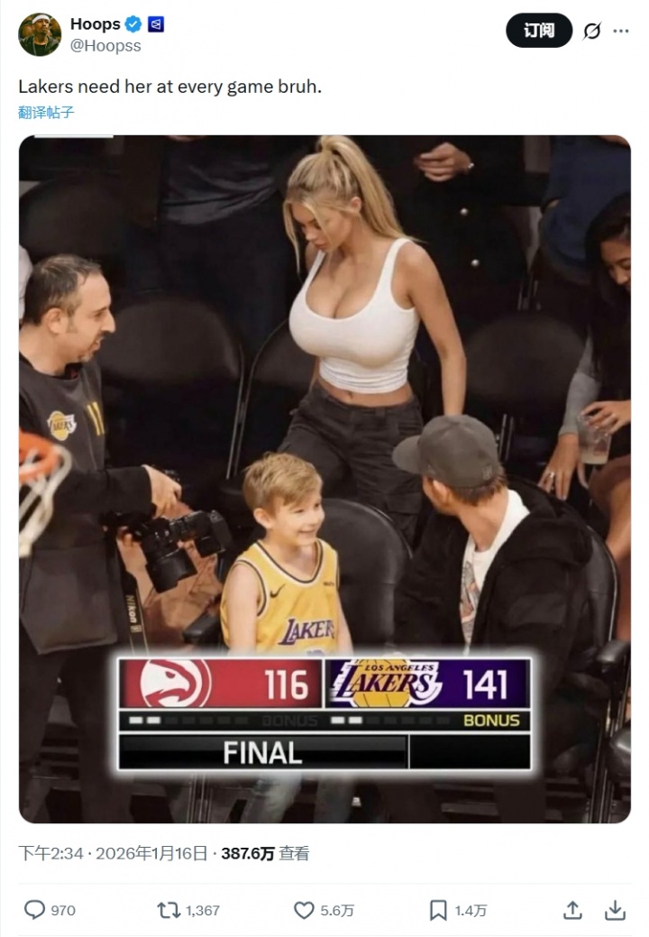 这位名为Ava的网红、身材炸裂的美女,此前观战湖人,湖人主场大胜老鹰。