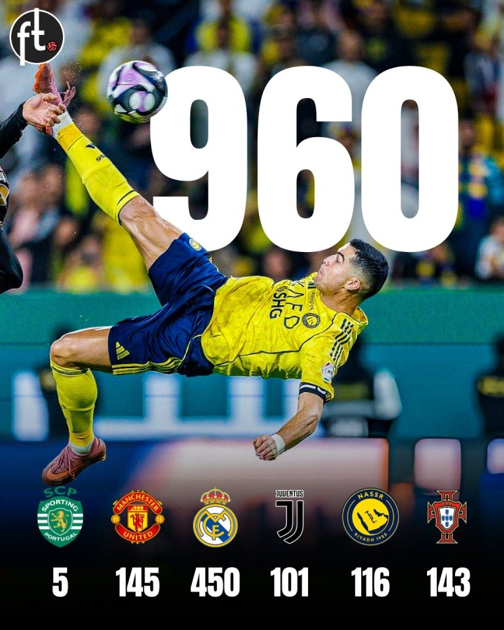 C罗代表葡萄牙队226场攻入143球、葡体31场5球、皇马438场450球、尤文134场101球、曼联346场145球,利雅得胜利131场116球。