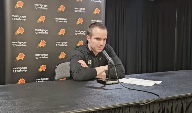赛后太阳主帅乔丹-奥特接受了记者采访,谈到了德文-布克,奥特表示:“老天,这家伙真是战士啊!之所以在第四节把他换回来,是因为我们知道他的脚踝很快就会肿起来。只要他准备好了,我们就会把他派上场。你可以看出来,在他投进一些球落地时,他其实感觉并不太好。”