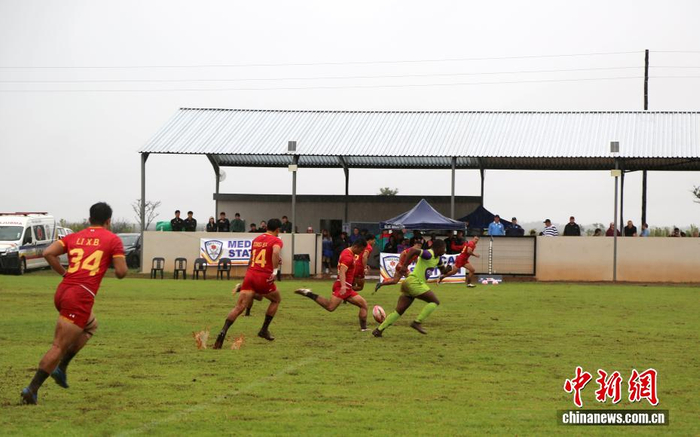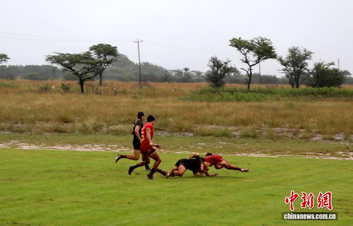 当地时间3月15日,中国七人制男子橄榄球队在南非林波波省莫迪莫勒与多只当地球队进行交流赛。图为中国队球员在场上奋力拼搏。中新社记者 孙翔 摄