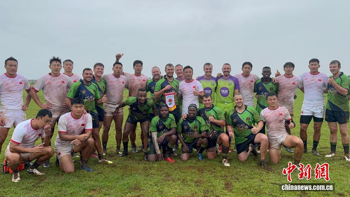 当地时间3月15日,中国七人制男子橄榄球队在南非林波波省莫迪莫勒与多只当地球队进行交流赛。图为中国队球员与南非当地球队赛后合影。中新社记者 孙翔 摄